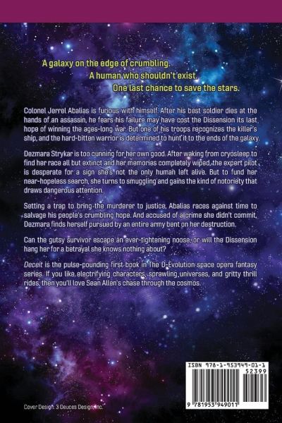 A galaxy on the edge of crumbling. A human who shouldn't exist. One last chance to save the stars. Colonel Jerrel Abalias is furious with himself. After his best soldier dies at the hands of an assassin, he fears his failure may have cost the Dissension its last hope of winning the ages-long war. But one of his troops recognizes the killer's ship, and the hard-bitten warrior is determined to hunt it to the ends of the galaxy. Dezmara Strykar is too cunning for her own good. After waking from cryosleep to find her race all but extinct and her memories completely wiped, the expert pilot is desperate for a sign she's not the only human left alive. But to fund her near-hopeless search, she turns to smuggling and gains the kind of notoriety that draws dangerous attention. Setting a trap to bring the murderer to justice, Abalias races against time to salvage his people's crumbling hope. And accused of a crime she didn't commit, Dezmara finds herself pursued by an entire army bent on her destruction. Can the gutsy survivor escape an ever-tightening noose, or will the Dissension hang her for a betrayal she knows nothing about? Deceit is the pulse-pounding first book in The D-Evolution space opera fantasy series. If you like electrifying characters, sprawling universes, and gritty thrill rides, then you'll love Sean Allen's chase through the cosmos.