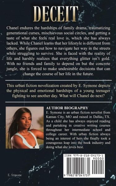 Chanel endures the hardships of family drama, traumatizing generational curses, mischievous social circles, and getting a taste of what she feels real love is, which she has always lacked. While Chanel learns that her lifestyle is different from others, she figures out how to navigate her way in the streets while struggling to survive. She is faced with the reality of life and harshly realizes that everything glitter isn't gold. With no friends and family to depend on but the concrete jungle, she is forced to make undesirable decisions that can change the course of her life in the future. This urban fiction novelization created by E. Symone depicts the physical and emotional hardships of a young teenager fighting to see another day. What will Chanel do next?