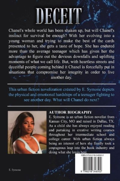 Chanel's whole world has been shaken up, but will Chanel's instinct for survival be enough? With her evolving into a young woman and trying to make the best of the cards presented to her, she gets a taste of hope. She has endured more than the average teenager which has given her the advantage to figure out the devious downfalls and uplifting moments of what we call life. But, with heartless streets and deceitful people coming behind it Chanel is forcefully put in situations that compromise her integrity in order to live another day. This urban fiction novelization created by E. Symone depicts the physical and emotional hardships of a teenager fighting to see another day. What will Chanel do next?