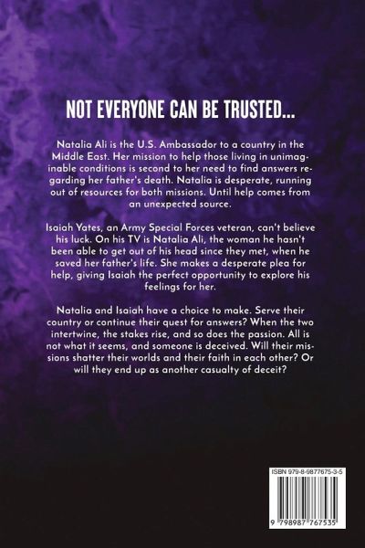 Natalia Ali is a U.S. Ambassador to the Middle East. Her mission to help those living in unimaginable conditions is second to her need to find answers regarding her father's death. Natalia is desperate, running out of resources for both missions. Until help comes from an unexpected source. Isaiah Yates, an Army Special Forces veteran, can't believe his luck. On his TV is Natalia Ali, the woman he hasn't been able to get out of his head since they met, when he saved her father's life. She makes a desperate plea for help, giving Isaiah the perfect opportunity to explore his feelings for her. Natalia and Isaiah have a choice to make. Serve their country or continue their quest for answers? When the two intertwine, the stakes rise, and so does the passion. All is not what it seems, and someone is deceived. Will their missions shatter their worlds and their faith in each other? Or will they end up as another casualty of deceit? This is the fourth book in a series of stand-alones. Each novel follows one of the heroes introduced in the series (Yates and his friends). Each hero gets his happy ever after. While there is a recommended reading order, each book can be enjoyed independently. This book (and series) contains detailed steamy scenes, cursing, and dark themes. These may be triggering or inappropriate for younger readers.