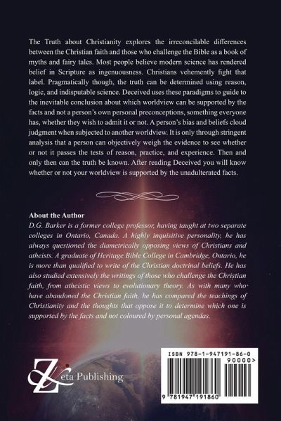The Truth about Christianity explores the irreconcilable differences between the Christian faith and those who challenge the Bible as a book of myths and fairy tales. Most people believe modern science has rendered belief in Scripture as ingenuousness. Christians vehemently fight that label. Pragmatically though, the truth can be determined using reason, logic, and indisputable science. Deceived uses these paradigms to guide to the inevitable conclusion about which worldview can be supported by the facts and not a person’s own personal preconceptions, something everyone has, whether they wish to admit it or not. A person’s bias and beliefs cloud judgment when subjected to another worldview. It is only through stringent analysis that a person can objectively weigh the evidence to see whether or not it passes the tests of reason, practice, and experience. Then and only then can the truth be known. After reading Deceived you will know whether or not your worldview is supported by the unadulterated facts.