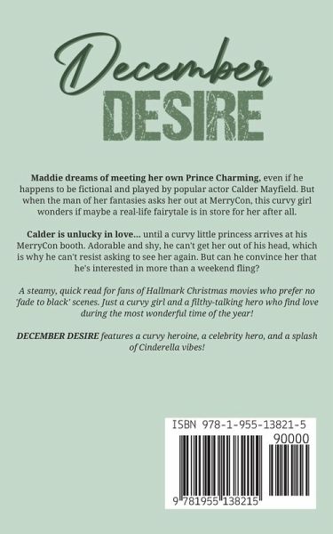 Maddie dreams of meeting her own Prince Charming, even if he happens to be fictional and played by popular actor Calder Mayfield. But when the man of her fantasies asks her out at MerryCon, this curvy girl wonders if maybe a real-life fairytale is in store for her after all. Calder is unlucky in love... until a curvy little princess arrives at his MerryCon booth. Adorable and shy, he can't get her out of his head, which is why he can't resist asking to see her again. But can he convince her that he's interested in more than a weekend fling? A steamy, quick read for fans of Hallmark Christmas movies who prefer no 'fade to black' scenes. Just a curvy girl and a filthy-talking hero who find love during the most wonderful time of the year! DECEMBER DESIRE features a curvy heroine, a celebrity hero, and a splash of Cinderella vibes!