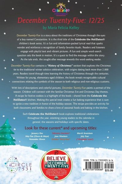 December Twenty-Five is a story about the traditions of Christmas through the eyes of a boy named Constantine. It is the third title of the Celebrate the HoliDates® children's book series. It's a fun and information-packed lyrical read that sparks wonder and reinforces a recognition of family-favorite rituals. Readers and listeners engage with playful text and vibrant pictures. A fun and simple word-search question sets the book in motion. It's a quest to find the message within the story. As the tale ends, the sought-after message rewards the word-seeking reader. December Twenty-Five contains a "History of Christmas" section that explores the Christmas tie to the traditional winter solstice celebration, with origins dating back more than 2,000 years. Readers travel through time learning the history of Christmas through the centuries. Written for young, elementary-aged children, the book reveals recognizable cultural connections relating the symbols of the season to both religious and non-religious customs. With lots of descriptions and colorful pictures, December Twenty-Five paints a portrait of the season. Children will connect with the familiar Christmas Eve and Christmas Day themes. A recipe for festive cookies is a highlight of the book-shared from the Celebrate the HoliDates® kitchen. Making the special treat creates a fun baking experience that is sure to ignite a new tradition in honor of the holiday season. The recipe provides an activity for both classrooms and families to share a love of seasonal foods and baking in the kitchen. Each Celebrate the HoliDates® book explores traditional celebrations throughout the year, orienting young readers to the calendar in general, the seasons and holidays with specific dates.
