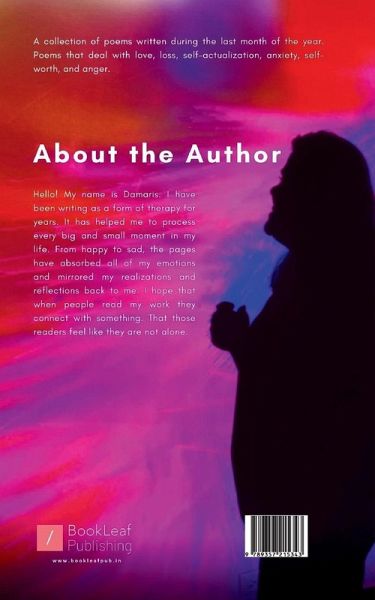 A collection of poems written during the last month of the year. Poems that deal with love, loss, self-actualization, anxiety, self-worth, and anger. A collection of poems written during the last month of the year. Poems that deal with love, loss, self-actualization, anxiety, self-worth, and anger.