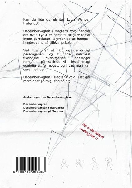 Kan du lide gurrelante? Lydia Wengen hader det. Decembervagten i Magtens Vold handler om hvad Lydia er parat til at gøre for at ingen gurrelante kommer op at hænge i hendes gang på Lillevangskolen. Ved hjælp af et rigt og genstridigt persongalleri, og til tider nærmest filosofiske overvejelser, undersøger romanen på satirisk vis hvad magt egentlig er for noget, og hvad man kan gøre med den. Decembervagten i Magtens Vold: Det gør mere ondt på mig, end på dig.