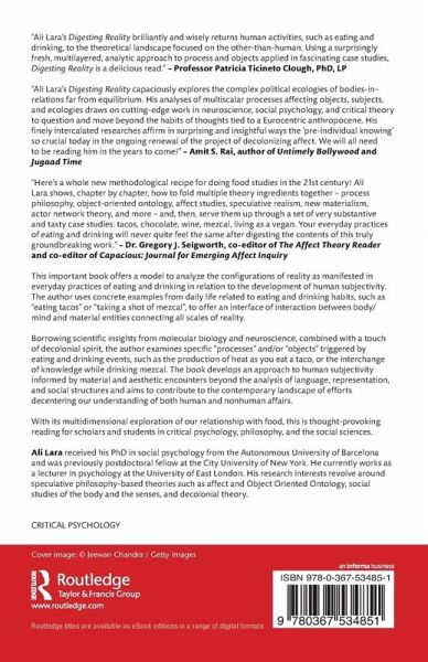 "Ali Lara's Digesting Reality capaciously explores the complex political ecologies of bodies-in-relations far from equilibrium. His analyses of multiscalar processes affecting objects, subjects, and ecologies draws on cutting edge work in neuroscience, social psychology, and critical theory to question and move beyond the habits of thoughts tied to a Eurocentric anthropocene. His finely intercalated researches affirm in surprising and insightful ways the "pre-individual knowing" so crucial today in the ongoing renewal of the project of decolonising affect. We will all need to be reading him in the years to come!" - Amit S. Rai, author of Untimely Bollywood and Jugaad Time (both Duke UP).