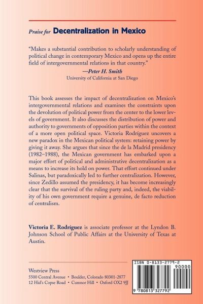 This book assesses the impact of decentralization on Mexico's intergovernmental relations and examines the constraints upon the devolution of political power from the center to the lower levels of government. It also discusses the distribution of power and authority to governments of opposition parties within the context of a more open political space. Victoria Rodríguez uncovers a new paradox in the Mexican political system: retaining power by giving it away. She argues that since the de la Madrid presidency (1982-1988), the Mexican government has embarked upon a major effort of political and administrative decentralization as a means to increase its hold on power. That effort continued under Salinas, but paradoxically led to further centralization. However, since Zedillo assumed the presidency, it has become increasingly clear that the survival of the ruling party and, indeed, the viability of his own government require a genuine, de facto reduction of centralism.