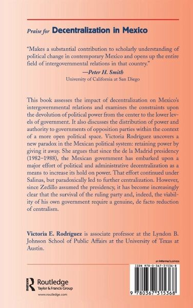 This book assesses the impact of decentralization on Mexico's intergovernmental relations and examines the constraints upon the devolution of political power from the center to the lower levels of government. It discusses the distribution of power and authority to governments of opposition parties.