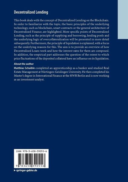 This book deals with the concept of Decentralized Lending on the Blockchain.In order to familiarize with the topic, the basic principles of the underlying technology, such as blockchain, smart contracts or the general architecture of Decentralized Finance, are highlighted. More specific points of Decentralized Lending, such as the principle of supplying and borrowing, lending pools and the underlying logic of overcollateralization will be presented in more detail subsequently. Furthermore, the principle of liquidation is explained, with a focus on the underlying reasons for this. The aim is to provide an overview of how Decentralized Loans work and how the interest rates for them are composed. In addition, the empirical part addresses the question of the extent to which price fluctuations of the deposited collateral have an influence on its liquidation.