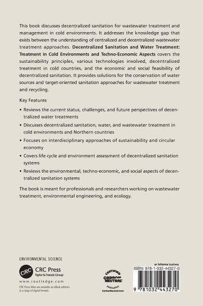 This book discusses decentralized sanitation for wastewater treatment and management in cold environments. It covers the life cycle and environmental assessment of decentralized sanitation systems. It includes topics like the treatment of run-off water from de-icing salt for road safety and the anaerobic treatment of wastewater.