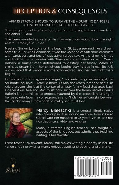 Aria is strong enough to survive the mounting dangers alone but grateful she doesn't have to. "I'm not going looking for a fight, but I'm not going to back down from one either." ~ Aria "I've been wondering for a while now what you would look like right before I kissed you." ~ Mac Meeting Simon Longoria on the beach in St. Lucia seemed like a dream come true. For Aria Donaldson, it was the vacation of a lifetime complete with sand, sun, and lots of raw, adventurous sex. At the time, Aria had no idea that her encounter with Simon would entwine her with Deuce Halprin, a sinister man determined to destroy her family. When an ominous dream from her childhood begins playing out in real life, Aria is convinced that Simon is somehow involved, and her real nightmare begins.In the midst of unimaginable danger, Aria meets her guardian angel, her soulmate, her lover-Mac Brunner. As Aria and Mac's romance heats up, Aria discovers that she is at the center of a nasty family feud that goes back a generation. Aria and Mac now must uncover the family secrets that Deuce Halprin is determined to protect. Haunted by the deception lurking in her past, Aria faces its consequences and finds herself caught between the life she always knew and the reality she must face.