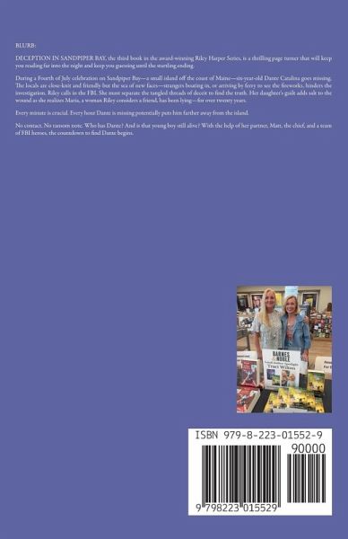 BLURB: DECEPTION IN SANDPIPER BAY, the third book in the award-winning Riley Harper Series, is a thrilling page turner that will keep you reading far into the night and keep you guessing until the startling ending. During a Fourth of July celebration on Sandpiper Bay-a small island off the coast of Maine-six-year-old Dante Catalina goes missing. The locals are close-knit and friendly but the sea of new faces-strangers boating in, or arriving by ferry to see the fireworks, hinders the investigation. Riley calls in the FBI. She must separate the tangled threads of deceit to find the truth. Her daughter's guilt adds salt to the wound as she realizes Maria, a woman Riley considers a friend, has been lying-for over twenty years. Every minute is crucial. Every hour Dante is missing potentially puts him farther away from the island. No contact. No ransom note. Who has Dante? And is that young boy still alive? With the help of her partner, Matt, the chief, and a team of FBI heroes, the countdown to find Dante begins.