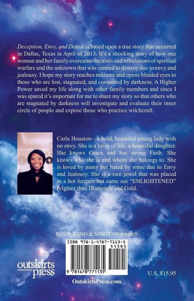 Deception, Envy, and Defeat is based upon a true story that occurred in Dallas, Texas in April of 2013. It's a shocking story of how one woman and her family overcame the trials and tribulations of spiritual warfare and the unknown that was created to destroy due to envy and jealousy. I hope my story reaches millions and opens blinded eyes to those who are lost, stagnated, and consumed by darkness. A Higher Power saved my life along with other family members and since I was spared it's important for me to share my story so that others who are stagnated by darkness will investigate and evaluate their inner circle of people and expose those who practice witchcraft.