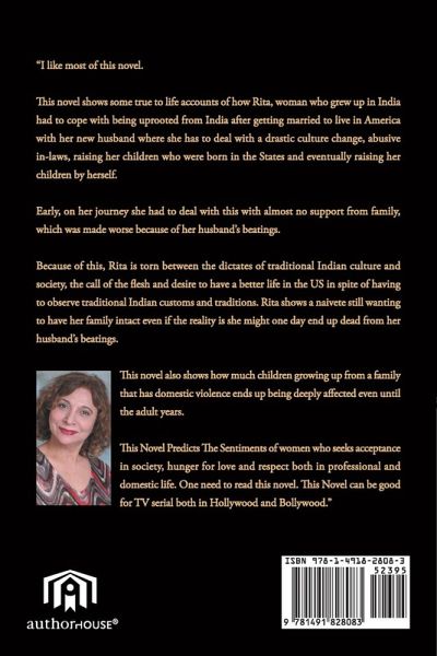 "I like most of this novel. This novel shows some true to life accounts of how Rita, woman who grew up in India had to cope with being uprooted from India after getting married to live in America with her new husband where she has to deal with a drastic culture change, abusive in-laws, raising her children who were born in the States and eventually raising her children by herself. Early, on her journey she had to deal with this with almost no support from family, which was made worse because of her husband's beatings. Because of this, Rita is torn between the dictates of traditional Indian culture and society, the call of the flesh and desire to have a better life in the US in spite of having to observe traditional Indian customs and traditions. Rita shows a naivete still wanting to have her family intact even if the reality is she might one day end up dead from her husband's beatings. This novel also shows how much children growing up from a family that has domestic violence ends up being deeply affected even until the adult years. This Novel Predicts The Sentiments of women who seeks acceptance in society, hunger for love and respect both in professional and domestic life. One need to read this novel. This Novel can be good for TV serial both in Hollywood and Bollywood."