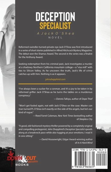 Rooting out deception is Jack O'Shea's stock-in-trade. On the road to redemption from his criminal past, reformed-swindler-turned-private-eye Jack O'Shea investigates a strange death at a shadowy Northern California mountain college-a "visa mill" with clandestine ties to Silicon Valley. Accompanied by his retired racing greyhound, Jack discovers the college is built on top of an abandoned gold mine. Dark secrets lie below. As he investigates the suspicious death, Jack's prior sins come back to haunt. He suspected one day there'd be a knock on his door. Deception may be his specialty but not everything is as it appears. Jack O'Shea was first introduced in a series of short stories published in Alfred Hitchcock's Mystery Magazine. The debut won the Shamus Award presented by the Private Eye Writers of America. The second in the series was a finalist for Bouchercon World Mystery Convention's Anthony Award. Critical Acclaim for Deception Specialist "I've always been a sucker for a conman, and it's a joy to be taken in by reformed grifter Jack O'Shea as he turns the tables on a murderous conspiracy." -Dennis Tafoya, author of Dope Thief "Won't get fooled again, not with Jack O'Shea on the case. Master con man turned PI, O'Shea isn't exactly on the side of the angels, but he's our kind of rogue." -Reed Farrel Coleman, New York Times bestselling author of Sleepless City "A good, old-fashioned mystery thriller powered by a completely original and compelling protagonist, John Shepphird's Deception Specialist speeds along at a breakneck pace while also tugging at your emotions. I read it in one sitting." -David Housewright, Edgar Award-winning author of In A Hard Wind "Jack O'Shea used to con people, but now he investigates on their behalf. It takes one to know one and he never misses a trick. He's got a scar on his face and one on his soul. Anytime he finds himself in over his head, he fights to rise. Deception Specialist is two stories in one and both will catch you holding your breath." -Jeffery Hess, author of Pascagoula Run, the Beachhead trilogy, No Salvation, and Scar Tissue "Scammers, schemers, and scoundrels are no match for former con man-turned-private eye Jack O'Shea. This Deception Specialist navigates a murderous conspiracy while confronting the ghosts of his swindling past in this edge-of-your-seat page turner." -Steve Jankowski, author of Below the Line "Tragedy turns a former conman into Shepphird's Deception Specialist A force for good in a world gone murderously bad." -Lawrence Maddox, author of Fast Bang Booze