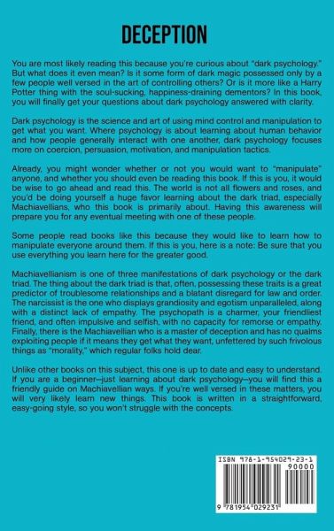 If you want to discover how some people always seem to get away with lies and manipulation, then keep reading... Have you ever found yourself in a situation where you always feel like you're out of control? Do you feel like a puppet-like someone else is always pulling your strings? Do you wonder why you continue to fall for lies and why you're so easily manipulated? Have you ever wondered how you can get the people who deceive and lie to you to quit? This book will show you how Machiavellian people are adept at hiding the truth from you, and how they manipulate, persuade, and negotiate with other people. Here's what you're going to learn:The dreaded dark triad of psychology. The actual meaning of Machiavellianism. The way a Machiavellian's mind works so that you'll never fall for their schemes again. Revealed: the dirty, nasty, manipulative tricks that Machiavellians use when negotiating with you. The kinds of people most likely to lie to you. Never before seen tips and tricks to catch a liar in a lie. The body language of a liar. The ways you can counter all the tricks that a Machiavellian can throw at you. The 21 principles of persuasion and how you can be as persuasive as your opponents. The difference between persuasion and manipulation. Who the target of a Machiavellian is-and how not to be a sucker. With this incredibly handy guidebook, you will finally feel like you have the upper hand when dealing with Machiavellians-and any situation where you need to be persuasive or negotiate. This book is full of stories, practical advice, and revealing information that helps you learn just how dark a Machiavellian's mind is, and how you can shield yourself from their ploys. From business to politics, to your personal life, never again will you be the victim, sucker, or fool. Scroll up and click the "add to cart" button to learn more about deception!