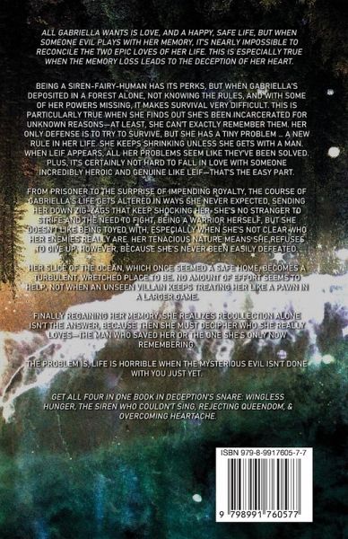 All Gabriella wants is love, and a happy, safe life, but when someone evil plays with her memory, it's nearly impossible to reconcile the two epic loves of her life. This is especially true when the memory loss leads to the deception of her heart. Being a siren-fairy-human has its perks, but when Gabriella's deposited in a forest alone, not knowing the rules, and with some of her powers missing, it makes survival very difficult. This is particularly true when she finds out she's been incarcerated for unknown reasons-at least, she can't exactly remember them. Her only defense is to try to survive, but she has a tiny problem ... a new rule in her life. She keeps shrinking unless she gets with a man. When Leif appears, all her problems seem like they've been solved. Plus, it's certainly not hard to fall in love with someone incredibly heroic and genuine like Leif-that's the easy part. From prisoner to the surprise of impending royalty, the course of Gabriella's life gets altered in ways she never expected, sending her down zig-zags that keep shocking her. She's no stranger to strife and the need to fight, being a warrior herself, but she doesn't like being toyed with, especially when she's not clear who her enemies really are. Her tenacious nature means she refuses to give up, however, because she's never been easily defeated. Her slice of the ocean, which once seemed a safe home, becomes a turbulent, wretched place to be. No amount of effort seems to help, not when an unseen villain keeps treating her like a pawn in a larger game. Finally regaining her memory, she realizes recollection alone isn't the answer, because then she must decipher who she really loves-the man who saved her or the one she's only now remembering. The problem is, life is horrible when the mysterious evil isn't done with you just yet. Get all four in one book in Deception's Snare: Wingless Hunger, The Siren Who Couldn't Sing, Rejecting Queendom, & Overcoming Heartache Tropes: Sea Stories, Fantastical Creatures, Romance First Fantasy, Romantasy, Open Door Spicy Romance, Magic