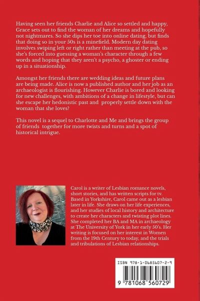 Having seen her friends Charlie and Alice so settled and happy, Grace sets out to find the woman of her dreams and hopefully not nightmares. So she dips her toe into online dating, but finds that doing so in your 50s is a minefield. Modern day dating involves swiping left or right rather than meeting at the pub, so she's forced into guessing a womans character through a few words and hoping that they aren't a psycho, a ghoster or ending up in a situationship. Amongst her friends there are wedding ideas and future plans are being made. Alice is now a published author and her job as an archaeologist is flourishing. However Charlie is bored and looking for new challenges, with ambitions of a change in lifestyle, but can she escape her hedonistic past and properly settle down with the woman that she loves? This novel is a sequel to Charlotte and Me and brings the group of friends together for more twists and turns and a spot of historical intrigue.