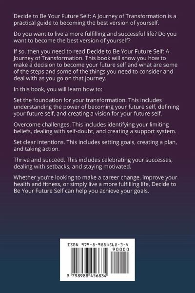 Do you want to live a more fulfilling and successful life? Do you want to become the best version of yourself? If so, you must read Decide to Be Your Future Self: A Journey of Transformation. This book will show you how to decide to become your future self, some of the steps, and some of the things you need to consider and deal with as you go on that journey. In this book, you will learn how to:Set the foundation for your transformation. This includes understanding the power of becoming your future self, defining your future self, and creating a vision for your future self. Overcome challenges. This includes identifying your limiting beliefs, dealing with self-doubt, and creating a support system. Set clear intentions. This includes setting goals, creating a plan, and taking action. Thrive and succeed. This includes celebrating your successes, dealing with setbacks, and staying motivated. Whether you want to make a career change, improve your health and fitness, or simply live a more fulfilling life, 'Decide to Be Your Future Self' can help you achieve your goals.