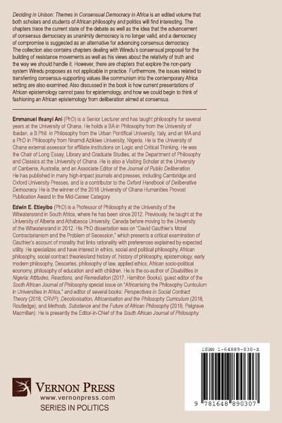 Deciding in Unison: Themes in Consensual Democracy in Africa is an edited volume that both scholars and students of African philosophy and politics will find interesting. The chapters trace the current state of the debate as well as the idea that the advancement of consensus democracy as unanimity democracy is no longer valid, and a democracy of compromise is suggested as an alternative for advancing consensus democracy. The collection also contains chapters dealing with Wiredu’s consensual proposal for the building of resistance movements as well as his views about the relativity of truth and the way we should handle it. However, there are also chapters that explore the non-party system Wiredu proposes as not applicable in practice. Furthermore, the issues related to transferring consensus-supporting values like communism into the contemporary Africa setting are also examined. Also discussed in the book is how current presentations of African epistemology cannot pass for epistemology, and how we could begin to think of fashioning an African epistemology from deliberation aimed at consensus.