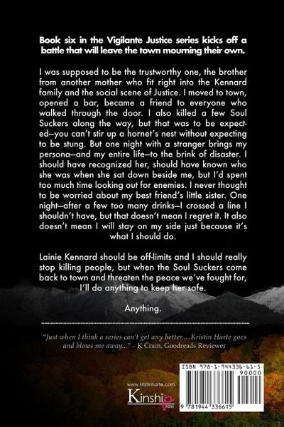 Book six in the Vigilante Justice series kicks off a battle that will leave the town mourning their own. I was supposed to be the trustworthy one, the brother from another mother who fit right into the Kennard family and the social scene of Justice. I moved to town, opened a bar, became a friend to everyone who walked through the door. I also killed a few Soul Suckers along the way, but that was to be expected-you can't stir up a hornet's nest without expecting to be stung. But one night with a stranger brings my persona-and my entire life-to the brink of disaster. I should have recognized her, should have known who she was when she sat down beside me, but I'd spent too much time looking out for enemies. I never thought to be worried about my best friend's little sister. One night-after a few too many drinks-I crossed a line I shouldn't have, but that doesn't mean I regret it. It also doesn't mean I will stay on my side just because it's what I should do. Lainie Kennard should be off-limits and I should really stop killing people, but when the Soul Suckers come back to town and threaten the peace we've fought for, I'll do anything to keep her safe. Anything.