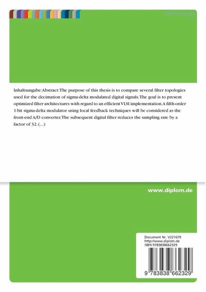 The purpose of this thesis is to compare several filter topologies used for the decimation of sigma-delta modulated digital signals. The goal is to present optimized filter architectures with regard to an efficient VLSI implementation. A fifth-order 1-bit sigma-delta modulator using local feedback techniques will be considered as the front-end A/D converter. The subsequent digital filter reduces the sampling rate by a factor of 32. The decimation filter must guarantee a narrow transition band between 0.5 and 0.55 and stopband attenuation of 100dB.