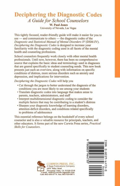 The goal of this book is to facilitate better communication between school counsellors and other mental-health professionals by enchancing counsellors' understanding of diagnostic codes and their use. W Paul Jones presents an overview of the basic ideas and terminology used in diagnosis, and examines specific conditions that school counsellors are likely to encounter.