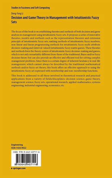 From the book reviews: "The main goal of the book under review is to establish theories and methods of both decision and game analysis in management using intuitionistic fuzzy sets (IFS). ... the presented results are very useful for theoreticians and practitioners of decision-making." (Krzysztof Piasecki, zbMATH, Vol. 1291, 2014)