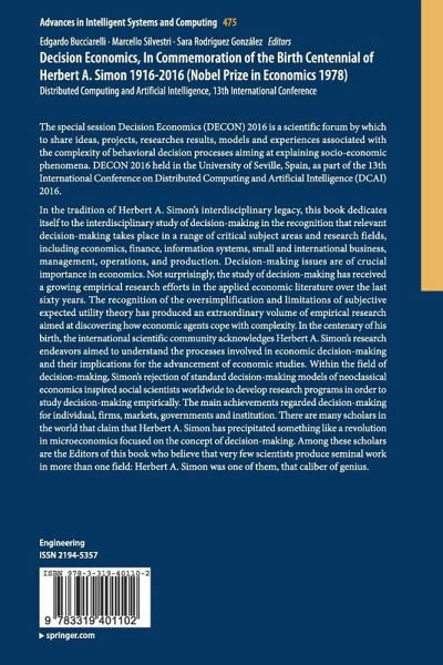 In the tradition of Herbert A. Simon's interdisciplinary legacy, this book dedicates itself to the interdisciplinary study of decision-making in the recognition that relevant decision-making takes place in a range of critical subject areas and research fields, including economics, finance, information systems, small and international business, management, operations, and production. Decision-making issues are of crucial importance in economics. Not surprisingly, the study of decision-making has received a growing empirical research efforts in the applied economic literature over the last sixty years. The recognition of the oversimplification and limitations of subjective expected utility theory has produced an extraordinary volume of empirical research aimed at discovering how economic agents cope with complexity. In the centenary of his birth, the international scientific community acknowledges Herbert A. Simon's research endeavors aimed to understand the processes involved in economic decision-making and their implications for the advancement of economic studies. Within the field of decision-making, Simon's rejection of standard decision-making models of neoclassical economics inspired social scientists worldwide to develop research programs in order to study decision-making empirically. The main achievements regarded decision-making for individual, firms, markets, governments and institution. There are many scholars in the world that claim that Herbert A. Simon has precipitated something like a revolution in microeconomicsfocused onthe concept of decision-making. Among these scholars are the Editors of this book who believe that very few scientists produce seminal work in more than one field: Herbert A. Simon was one of them, that caliber of genius.