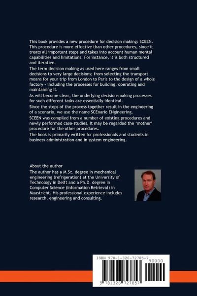 This book provides a new procedure for decision making: SCEEN. This procedure is more effective than other procedures, since it treats all important steps and takes into account human mental capabilities and limitations. For instance, it is both structured and iterative. The term decision making as used here ranges from small decisions to very large decisions; from selecting the transport means for your trip from London to Paris to the design of a whole factory - including the processes for building, operating and maintaining it. The underlying decision-making processes for such different tasks are essentially identical. SCEEN was compiled from a number of existing procedures and newly performed case-studies. It may be regarded the 'mother' procedure for the other procedures. The book is primarily written for professionals and students in business administration and in system engineering.