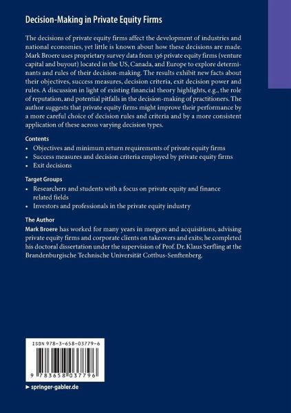 The decisions of private equity firms affect the development of industries and national economies, yet little is known about how these decisions are made. Mark Broere uses proprietary survey data from 136 private equity firms (venture capital and buyout) located in the US, Canada, and Europe to explore determinants and rules of their decision-making. The results exhibit new facts about their objectives, success measures, decision criteria, exit decision power and rules. A discussion in light of existing financial theory highlights, e.g. the role of reputation, and potential pitfalls in the decision-making of practitioners. The author suggests that private equity firms might improve their performance by a more careful choice of decision rules and criteria and by a more consistent application of these across varying decision types.