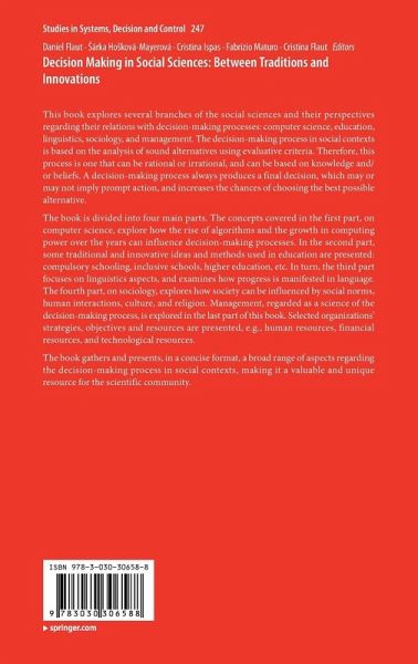 This book explores several branches of the social sciences and their perspectives regarding their relations with decision-making processes: computer science, education, linguistics, sociology, and management. The decision-making process in social contexts is based on the analysis of sound alternatives using evaluative criteria. Therefore, this process is one that can be rational or irrational, and can be based on knowledge and/or beliefs. A decision-making process always produces a final decision, which may or may not imply prompt action, and increases the chances of choosing the best possible alternative. The book is divided into four main parts. The concepts covered in the first part, on computer science, explore how the rise of algorithms and the growth in computing power over the years can influence decision-making processes. In the second part, some traditional and innovative ideas and methods used in education are presented: compulsory schooling, inclusive schools, higher education, etc. In turn, the third part focuses on linguistics aspects, and examines how progress is manifested in language. The fourth part, on sociology, explores how society can be influenced by social norms, human interactions, culture, and religion. Management, regarded as a science of the decision-making process, is explored in the last part of this book. Selected organizations' strategies, objectives and resources are presented, e.g., human resources, financial resources, and technological resources. The book gathers and presents, in a concise format, a broad range of aspects regarding the decision-making process in social contexts, making it a valuable and unique resource for the scientific community.