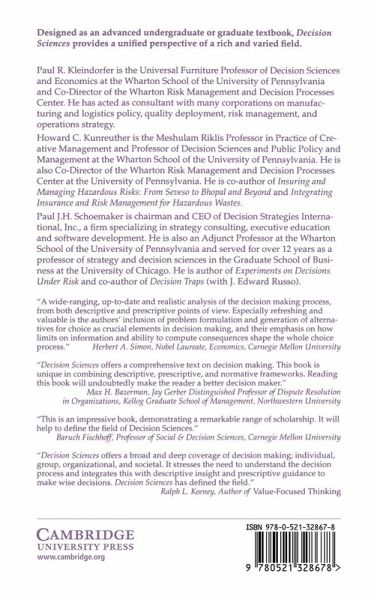 This long-awaited textbook provides a unified perspective of a rich and varied field. It recognises that in order to develop strategies for improving the decision-making process one needs to understand how decisions are made in practice and in what ways behaviour differs from guidelines implied by normative theories of choice. It is the interplay between descriptive, normative, and prescriptive analysis that gives this book a special flavour. Using a set of illustrative examples, Decision Sciences synthesises current research about different types of decision making, including individual, group, organisational, and societal. Special attention is given to the linkage between problem finding and problem solving. The principal message emerging from the book is that decision making entails a complex set of processes that need to be understood in order to develop sound prescriptions or policy advice.