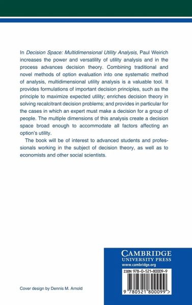 In Decision Space: Multidimensional Utility Analysis, first published in 2001, Paul Weirich increases the power and versatility of utility analysis and in the process advances decision theory. Combining traditional and novel methods of option evaluation into one systematic method of analysis, multidimensional utility analysis is a valuable tool. It provides formulations of important decision principles, such as the principle to maximize expected utility; enriches decision theory in solving recalcitrant decision problems; and provides in particular for the cases in which an expert must make a decision for a group of people. The multiple dimensions of this analysis create a decision space broad enough to accommodate all factors affecting an option's utility. The book will be of interest to advanced students and professionals working in the subject of decision theory, as well as to economists and other social scientists.