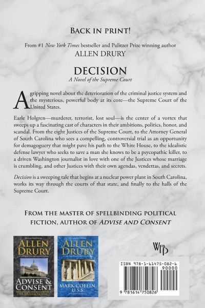 A gripping novel about the deterioration of the criminal justice system and the mysterious, powerful body at its core-the Supreme Court of the United States. Earle Holgren-murderer, terrorist, lost soul-is the center of a vortex that sweeps up a fascinating cast of characters in their ambitions, politics, honor, and scandal. From the eight Justices of the Supreme Court, to the Attorney General of South Carolina who sees a compelling, controversial trial as an opportunity for demagoguery that might pave his path to the White House, to the idealistic defense lawyer who seeks to save a man she knows to be a psycopathic killer, to a driven Washington journalist in love with one of the Justices whose marriage is crumbling, and other Justices with their own agendas, vendettas, and secrets, Decision is a sweeping tale that begins at a nuclear power plant in South Carolina, works its way through the courts of that state, and finally to the halls of the Supreme Court. From Allen Drury, the master of spellbinding political fiction, author of Advise and Consent