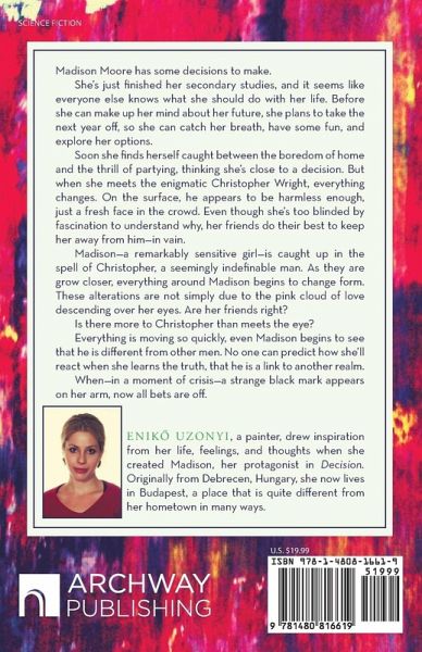 Madison Moore has some decisions to make. She's just finished her secondary studies, and it seems like everyone else knows what she should do with her life. Before she can make up her mind about her future, she plans to take the next year off, so she can catch her breath, have some fun, and explore her options. Soon she finds herself caught between the boredom of home and the thrill of partying, thinking she's close to a decision. But when she meets the enigmatic Christopher Wright, everything changes. On the surface, he appears to be harmless enough, just a fresh face in the crowd. Even though she's too blinded by fascination to understand why, her friends do their best to keep her away from him--in vain. Madison--a remarkably sensitive girl--is caught up in the spell of Christopher, a seemingly indefinable man. As they are grow closer, everything around Madison begins to change form. These alterations are not simply due to the pink cloud of love descending over her eyes. Are her friends right? Is there more to Christopher than meets the eye? Everything is moving so quickly, even Madison begins to see that he is different from other men. No one can predict how she'll react when she learns the truth, that he is a link to another realm. When--in a moment of crisis--a strange black mark appears on her arm, now all bets are off.
