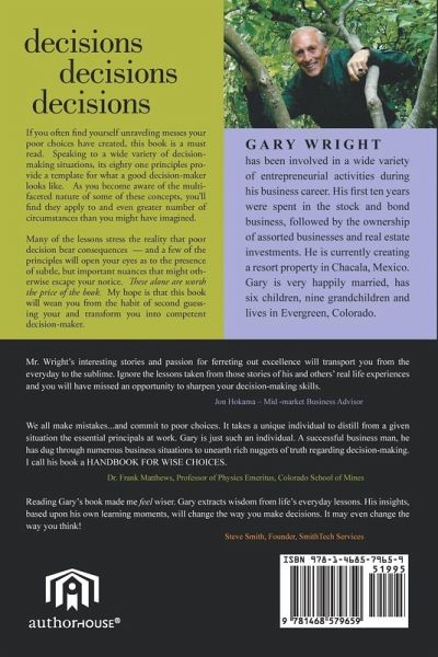 decisions decisions decisions If you often find yourself unraveling messes your poor choices have created, this book is a must read. Speaking to a wide variety of decision-making situations, its seventy seven principles provide the template for what a good decision-maker looks like. As you become aware of the multifaceted nature of some of these concepts, you'll find they apply to an even greater number of circumstances than you might have imagined. Many of the lessons stress the reality that poor decisions bear consequences-and a few of the principles will open your eyes to the presence of subtle, but important nuances that might otherwise escape your notice. These, alone are worth the price of the book. My hope is that this book will wean you from the habit of second guessing yourself and transform you into a competent decision-maker.