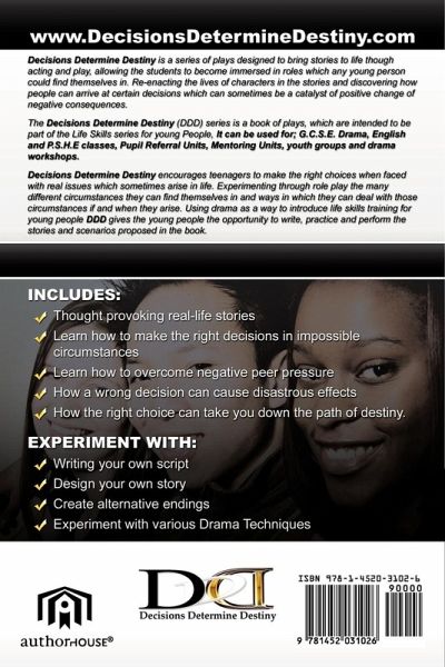 Decisions Determine Destiny is a series of plays designed to bring stories to life though acting and play, allowing the students to become immersed in roles which any young person could find themselves in. Re-enacting the lives of characters in the stories and discovering how people can arrive at certain decisions which can sometimes be a catalyst of positive change of negative consequences. The Decisions Determine Destiny (DDD) series is a book of plays, which are intended to be part of the Life Skills series for young People, It can be used for; G.C.S.E. Drama, English and P.S.H.E classes, Pupil Referral Units, Mentoring Units, youth groups and drama workshops. Decisions Determine Destiny encourages teenagers to make the right choices when faced with real issues which sometimes arise in life. Experimenting through role play the many different circumstances they can find themselves in and ways in which they can deal with those circumstances if and when they arise. Using drama as a way to introduce life skills training for young people DDD gives the young people the opportunity to write, practice and perform the stories and scenarios proposed in the book.