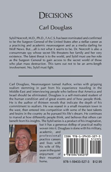 Sybil Goes From Spy to Surgeon General to a Threat of Impeachment--Sybil Norcroft, M.D., Ph.D., F.A.C.S. has been nominated and confirmed to be the Surgeon General of the United States after a stellar career as a practicing and academic neurosurgeon and as a media darling for Wolf News. But...all is not what it seems to be. Dr. Norcroft is also a consummate spy whose secret life threatens her family and her very existence. The latest threat is to the world, and Sybil must use her role as the Surgeon General to gain access to the secret world of those who plan mass destruction. This turns out not to be an arms-length involvement. No, Sybil must fight.