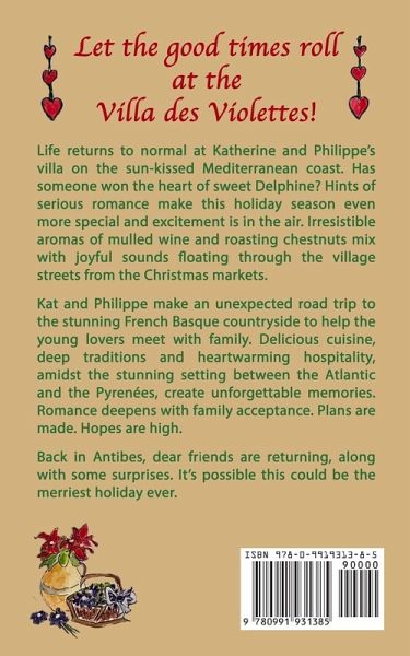 Let the good times roll at the Villa des Violettes! Life returns to normal at Katherine and Philippe's villa on the sun-kissed Mediterranean coast. Has someone won the heart of sweet Delphine? Hints of serious romance make this holiday season even more special and excitement is in the air. Irresistible aromas of mulled wine and roasting chestnuts mix with joyful sounds floating through the village streets from the Christmas markets. Kat and Philippe make an unexpected road trip to the stunning French Basque countryside to help the young lovers meet with family. Delicious cuisine, deep traditions and heartwarming hospitality, amidst the stunning setting between the Atlantic and the Pyrenées, create unforgettable memories. Romance deepens with family acceptance. Plans are made. Hopes are high. Back in Antibes, dear friends are returning, along with some surprises. It's possible this could be the merriest holiday ever.