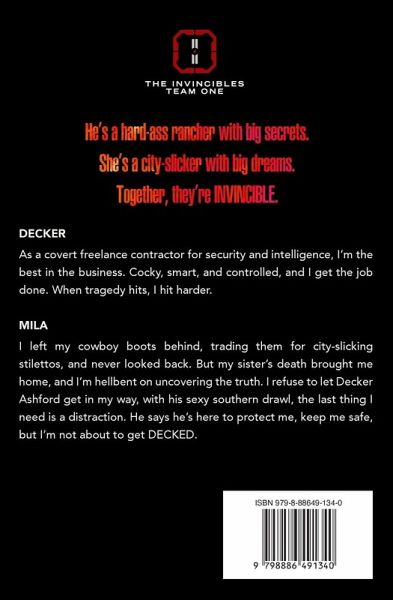 He's a hard-ass rancher with big secrets. She's a city-slicker with big dreams. Together, they're INVINCIBLE. DECK As a covert freelance contractor for security and intelligence, I'm the best in the business. Cocky, smart, and controlled, and I get the job done. When tragedy hits, I hit harder. ¿MILA I left my cowboy boots behind, trading them for city-slicking stilettos, and never looked back. But my sister's death brought me home, and I'm hellbent on uncovering the truth. I refuse to let Decker Ashford get in my way, with his sexy southern drawl, the last thing I need is a distraction. He says he's here to protect me, keep me safe, but I'm not about to get DECKED.