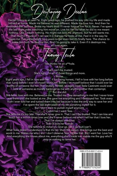 DESTROYING DECLAN Declan Gilroy is an assh*le. Eight years ago, he pushed his way into my life and made himself at home. Made me believe he was different. Made me love him. And then he destroyed me. Left me. Broke my heart. And I'll never forgive him for it. Never. I've spent the last eight years watching him move on. Live his life like what he did to me meant nothing. Like I meant nothing. He might not love me anymore, but he still wants me. That much I'm sure of. I can see it in the way he looks at me. Feel it in the way he kisses me. I've waited eight long years to get even but it's finally here. The chance to make him hurt. To destroy him. And I'm going to take it. Even if it destroys me, all over again. TAMING TESLA Tess thinks I'm an assh*le. A liar. That I can't be trusted. She's right. I'm all of those things and more. Worse. I can't be trusted. I am a liar. I am an assh*le. What she doesn't get is that it's her. She's the reason. She brings out the best and the worst in me. Makes me who I am. I don't deserve Tess. I know that. But I want her. Love her. And everything she knows about me, everything she's made me, makes me the guy who will stop at nothing to tame her.