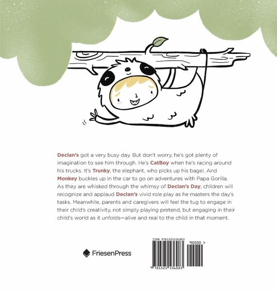 Declan's got a very busy day. But don't worry, he's got plenty of imagination to see him through. He's CatBoy when he's racing around his trucks. It's Trunky, the elephant, who picks up his bagel. And Monkey buckles up in the car to go on adventures with Papa Gorilla. As they are whisked through the whimsy of Declan's Day, children will recognize and applaud Declan's vivid role play as he masters the day's tasks. Meanwhile, parents and caregivers will feel the tug to engage in their child's creativity, not simply playing pretend, but engaging in their child's world as it unfolds-alive and real to the child in that moment.