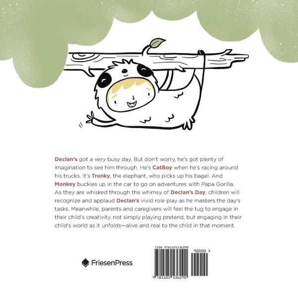 Declan's got a very busy day. But don't worry, he's got plenty of imagination to see him through. He's CatBoy when he's racing around his trucks. It's Trunky, the elephant, who picks up his bagel. And Monkey buckles up in the car to go on adventures with Papa Gorilla. As they are whisked through the whimsy of Declan's Day, children will recognize and applaud Declan's vivid role play as he masters the day's tasks. Meanwhile, parents and caregivers will feel the tug to engage in their child's creativity, not simply playing pretend, but engaging in their child's world as it unfolds-alive and real to the child in that moment.