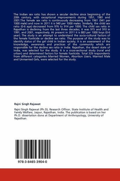 The Indian sex ratio has shown a secular decline since beginning of the 20th century, with exceptional improvements during 1951, 1981 and 2001.The female sex ratio is continuously decreasing from 1961 (941 per 1000 male) and now in 2011 it is 940 per 1000 males. Similarly, the child sex ratio (0-6 age) decreased from 976 to 914 per 1000. The child sex ratio in Rajasthan is declining from the last three decades; it was 915 and 910 in 1991, and 2001, respectively. At present in 2011 it is 883 per 1000 boys (0-6 year). The study is an attempt to understand the socio-cultural factors of the female foeticide or decline sex ratio. The purpose of the study was to identify status of the girl child in Indian society; it is an assessment of the knowledge, awareness and practices of the community which are responsible for the decline sex ratio in India. Rajasthan, the desert state of India, was selected for the study. It is a cross-sectional study (rural and urban) and determined factors for female foeticide. Total 329 respondents from different categories-.Married Women, Abortion Users, Married Male and Unmarried Girls, were selected for the study.