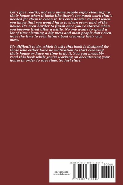 Let's face reality, not very many people enjoy cleaning up their house when it looks like there's too much work that's needed for them to clean it. It's even harder to start when you know that you would have to clean every part of the house. It's even harder to finish once you've started when you become tired after a while. No one wants to spend a lot of time cleaning a big mess and most people don't even have the time to even think about cleaning their own mess. It's difficult to do, which is why this book is designed for those who either have no motivation to start cleaning their house or have no time to do it. You can probably read this book while you're working on decluttering your house in order to save time. So just start.