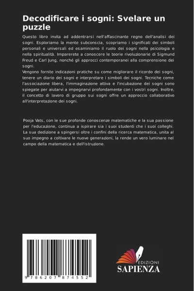 Questo libro invita ad addentrarsi nell'affascinante regno dell'analisi dei sogni. Esploriamo la mente subconscia, scopriamo i significati dei simboli personali e universali ed esaminiamo il ruolo dei sogni nella psicologia e nella spiritualità. Imparerete a conoscere le teorie rivoluzionarie di Sigmund Freud e Carl Jung, nonché gli approcci contemporanei alla comprensione dei sogni.Vengono fornite indicazioni pratiche su come migliorare il ricordo dei sogni, tenere un diario dei sogni e interpretare i simboli dei sogni. Tecniche come l'associazione libera, l'immaginazione attiva e l'incubazione dei sogni sono spiegate per aiutarvi a impegnarvi profondamente con i vostri sogni. Inoltre, il concetto di lavoro di gruppo sui sogni offre un approccio collaborativo all'interpretazione dei sogni.
