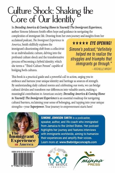 In Decoding America and Coming Home to Yourself: The Immigrant Experience, author Simone Johnson Smith offers hope and guidance in navigating the complexities of immigrant life. Drawing from her own journey and insights from her acclaimed podcast, The Immigrant Experience in America, Smith skillfully explores the immigrant's disorienting shift from a collectivist to an individualistic culture, delving into the profound culture shock and the transformative process of becoming a hybrid identity, which she terms a "Third-Culture Person" capable of bridging both cultures. This book is a practical guide and a powerful call to action, urging you to embrace and harness your unique identity and heritage as sources of strength. By understanding daily cultural norms and celebrating our roots, we can bridge cultural divides and transform our differences into valuable assets, making a meaningful contribution to American society. Decoding America and Coming Home to Yourself: The Immigrant Experience is an essential roadmap for navigating cultural barriers, reclaiming your sense of belonging, and tapping into your unique strengths--your Superpower! Your journey to empowerment starts here!