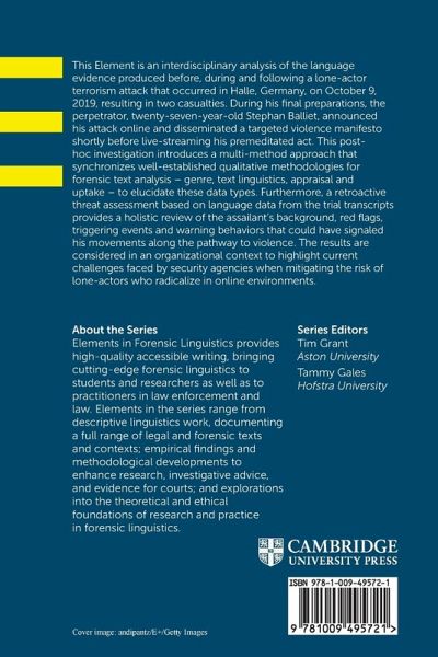 This Element is an interdisciplinary analysis of language evidence from a lone-actor terrorism attack in Halle, Germany, involving Stephan Balliet. It uses a multi-method approach, including genre, text linguistics, appraisal, and uptake, to elucidate data and provide a review of the assailant's background, warning behaviors, and red flags.