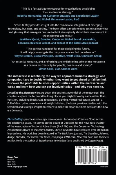 Chapter 00: Introduction; Section ONE: Decoding the platform; Chapter 01: Web 1.0, Web 2.0, Web 3.0; Chapter 02: The metaverse; Chapter 03: Blockchain; Section TWO: Decoding the experience; Chapter 04: NFTs; Chapter 05: Gaming; Chapter 06: Entertainment; Chapter 07: Digital fashion; Chapter 08: Tokenomics; Chapter 09: 3D worlds; Chapter 10: Infrastructure Endpoints, central systems, network, software and AI; Section THREE: Decoding the imperative; Chapter 11: Ethics, privacy, security and standards; Chapter 12: Connection, unity and community; Chapter 13: The world of empowerment